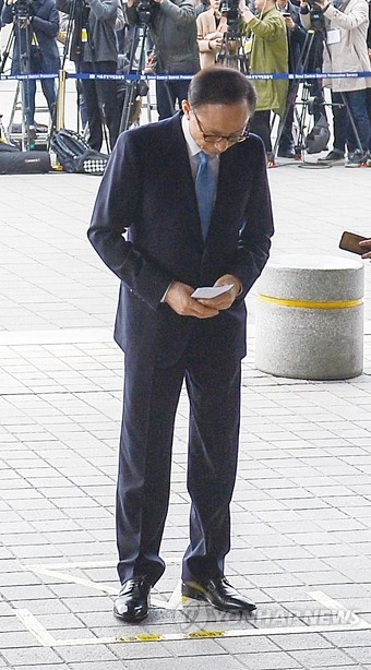 뇌물수수·횡령·조세포탈 등 혐의를 받는 이명박 전 대통령이 14일 오전 서울 서초구 서울중앙지검에 피의자 신분으로 출석, 고개를 숙이고 있다.