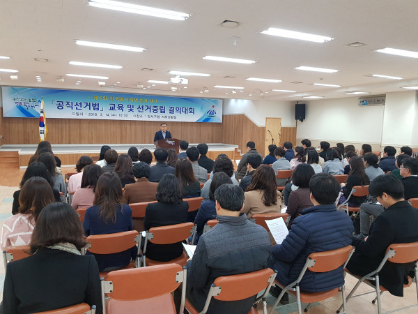 서울 강서구가 ‘제7회 전국동시지방선거’를 앞두고 14일 구청 지하상황실에서 ‘지방선거 선거중립 결의대회’를 개최하고, 정치적 중립 의무를 준수할 것을 결의했다. 사진은 결의대회에 참석한 구청 관계자들이 결의문을 낭독하고 있는 모습. (사진제공=강서구청)