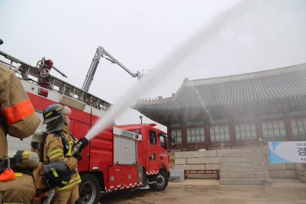 종로소방서가 15일 경복궁 수정전에서 소방차량 7대를 투입, 소방공무원 30명, 자위소방대 20명 등 총 50여명과 함께 ‘초기 화재대응능력 강화 유관기관 합동 훈련’을 실시했다. 사진은 건물을 향해 물대포를 쏘고 있는 소방대원들의 모습. (사진제공=종로구청)