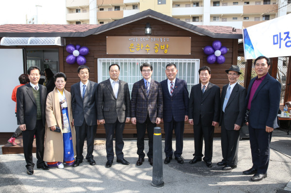 성동구가 최근 마장동 30통 지역 주거환경 개선사업의 일환으로 마을공동체 활성화 거점 공간으로 조성한 ‘마장동 은하수 공방’의 개소식을 개최했다. 사진은 개소식에 참석한 관계자들이 기념촬영을 하는 모습. (사진제공=성동구청)