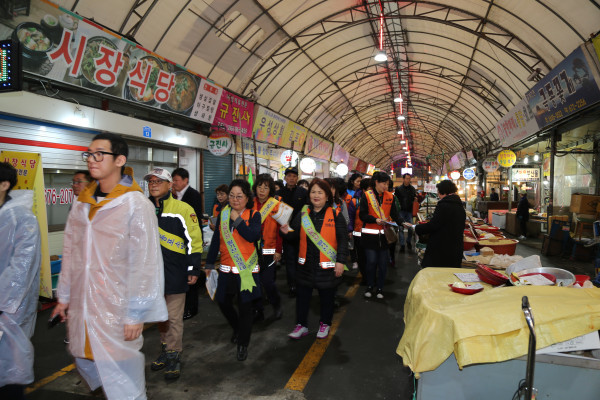 영등포소방서는 15일 오후 5시 영등포전통시장에서 구청 및 경찰 관계자등 70여명이 참석한 가운데 효율적인 화재진압과 예방을 위한 전통시장 유관기관 합동소방통로 확보훈련을 실시했다. 사진은 소방통로 확보훈련이 진행 중인 모습. (사진제공=영등포소방서)