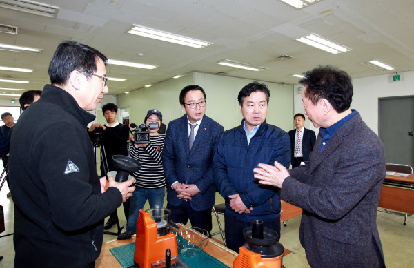 [수원=채종수 기자]홍종학 중소벤처기업부 장관이 경기도의회와 함께 최근 경기 안양시에 위치한 공영홈쇼핑 판매 우수기업 (주)홈밀맷돌을 방문, 직원들을 격려하고 애로사항을 청취했다. 사진은 홍 장관이 업체 관계자로부터 설명을 듣고 있는 모습.(사진제공=경기도의회)