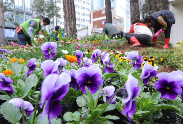 19일 오전 서울 종로구청 앞 화단에 봄꽃 심기가 한창이다.