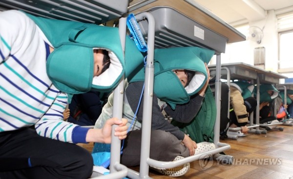 지진 훈련··· “머리 보호해요”