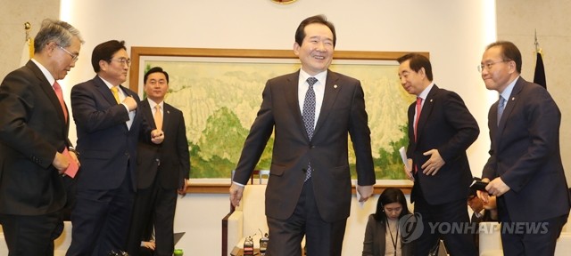 정세균 국회의장과 여야 3당 교섭단체 원내대표가 19일 국회 의장접견실에서 열린 여야 3당 교섭단체 원내대표 정례회동에서 공개 발언을 마친 뒤 비공개 협상을 위해 자리에서 일어나고 있다. 왼쪽부터 바른미래당 김동철·더불어민주당 우원식 원내대표, 정세균 국회의장, 자유한국당 김성태 원내대표, 윤재옥 원내수석부대표.