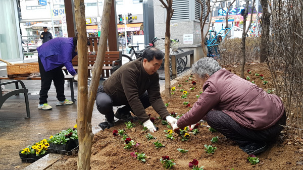 경기 용인시 기흥구 신갈동은 19일 청사주변 화단에서 지역내 7개 단체 회원들과 지역주민 등 20여명이 참석한 가운데 ‘봄꽃심기 행사’를 개최하고 봄꽃 4000본을 식재했다. 사진은 행사에 참석한 관계자들이 봄꽃을 식재하는 모습. (사진제공=용인시청)