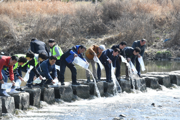 경기 오산시가 지난 17일 유엔(UN)이 제정한 ‘세계 물의 날(World water day)’ 행사를 개최하고, 오산천과 오산천 지류하천 등지에서 정화활동 및 쏘가리 방류행사를 진행했다. 사진은 쏘가리를 방류하고 있는 시 관계자들의 모습. (사진제공=오산시청)
