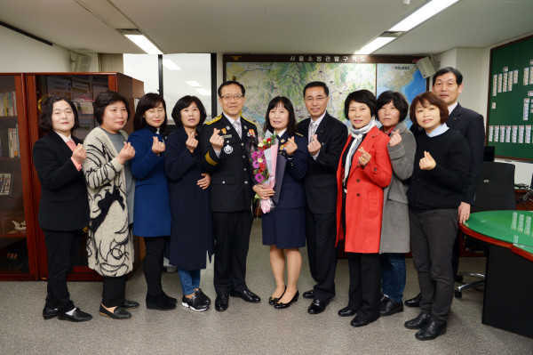 동작소방서는 19일 서울소방재난본부에서 동작소방서 신임 여성의용소방대장에 대한 임명식을 가졌다. 사진은 임명식이 끝난 후 관계자들이 기념촬영을 하는 모습. (사진제공=동작소방서)