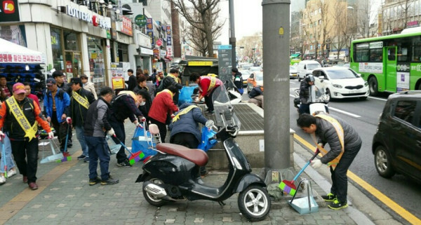 다가오는 봄을 맞아 종로구가 최근 동대문역~동묘앞역 구간 노점상인들과 함께 ‘거리가게(노점) 주변 봄맞이 환경정비’ 를 실시했다. 사진은 지하철 환기구 주변을 청소하고 있는 상인들의 모습. (사진제공=종로구청)