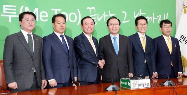 민주평화당 장병완 원내대표와 정의당 노회찬 원내대표가 20일 국회 평화당 대표실에서 공동교섭단체 구성을 위해 만나 악수하고 있다. 왼쪽부터 민주평화당 최경환 이용주 장병완, 정의당 노회찬 윤소하 김종대 의원.