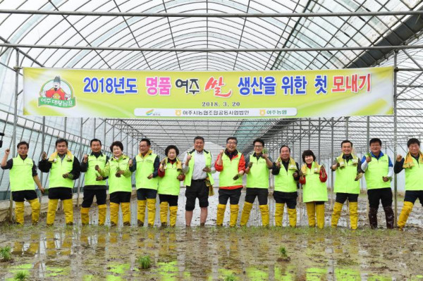 경기 여주시는 20일 우만동에 위치한 홍기완씨 농가에서 정병국 국회의원을 비롯해 시장 등 시 관계자, 지역주민 등이 참석한 가운데 ‘올해 첫 모내기 행사’를 개최했다. 사진은 행사에 참여한 관계자들이 모내기에 앞서 기념촬영을 하는 모습. (사진제공=여주시청)