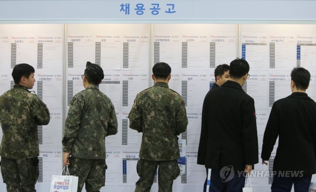 21일 고양 킨텍스 제2전시장에서 열린 2018전역예정장병 취업박람회에서 장병들이 채용공고를 살펴 보고 있다.