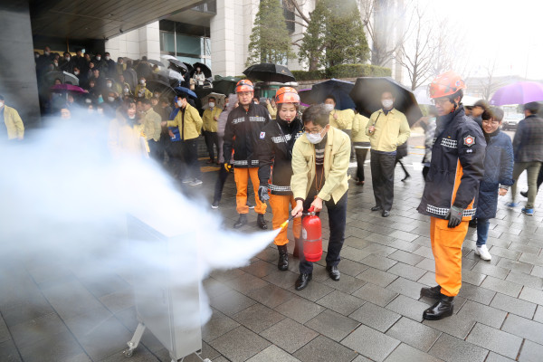 종로소방서는 21일 제406차 민방위의 날 종로구 세종대로에 위치한 정부서울청사 건물에서 화재 발생에 대비 피난대피 및 종합방수 등 소방훈련을 실시했다. 사진은 참여자들이 소화기 사용 실습을 하고 있는 모습. (사진제공=종로소방서)
