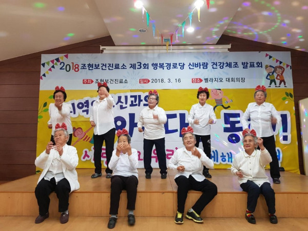 경기 양평군보건소는 지난 16일 용문면 신점리 벨라지오 대강당에서 지역주민 160여명이 참석한 가운데 ‘제3회 행복 경로당 신바람 건강체조 발표회’를 개최했다. 사진은 행사에 참여한 지역노인들이 체조를 선보이고 있는 모습. (사진제공=양평군청)