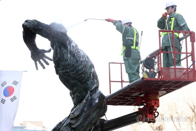 22일 오전 서울 송파구 올림픽로에서 송파구청 관계자들이 중앙분리대에 설치된 올림픽 상징 조형물을 세척하고 있다.