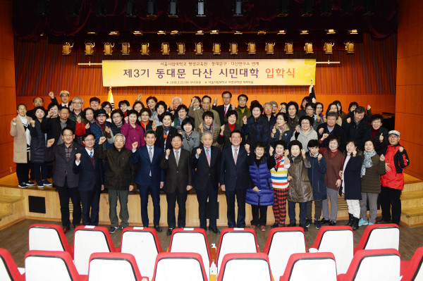 동대문구는 최근 서울시립대학교에서 수강생 약 60명 등 150여명이 참석한 가운데 ‘제3기 동대문 다산 시민대학 입학식’을 개최했다. 사진은 행사 참여들이 기념촬영을 하고 있는 모습. (사진제공=동대문구청)