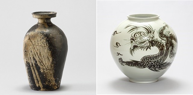 | ▲ 사진 좌측 입넓은 편병과 우측 김정옥-철화백자용문호 | ||