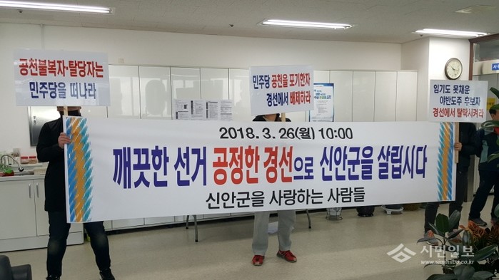 [신안=황승순 기자] 민주당 전남도당사에서 6.13 신안군수 민주당 후보 적격심사를 앞두고 신안지역 일부 당원들이 공원심사기준을 열거하며 최근 입당내지 복당대상자들에 대한 엄격한 심사기준 적용을 촉구하고 나섰다. 이들은 엄격한 도덕적 기준을 강화해 줄 것을 요구하는 탄원서 제출과 피켓시위를 했다.