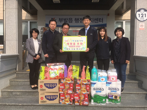 최근 경기 이천시 부발읍은 (주)팔도 소속 직원들로 구성된 ‘팔도나눔봉사단’으로부터 지역내 어려운 이웃들을 위해 사용해달라며 기탁한 성품을 전달 받았다. 사진은 성품 전달식에 참석한 관계자들이 기념촬영을 하는 모습. (사진제공=이천시청)
