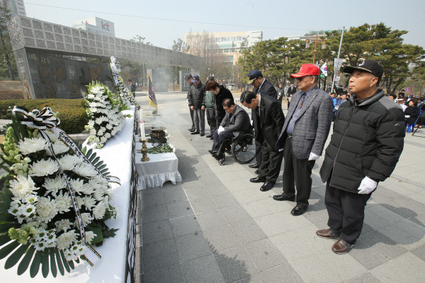 경기 부천시는 26일 '안중근 의사 순국 108주기 추모식'을 부천 안중근공원에서 진행했다. 광복회 부천시지회에서 주관한 추모식에는 유관기관 단체장 및 시민 등 200여명이 참석했다. 사진은 참석자들이 안중근 의사를 추모하는 모습. (사진제공=부천시청)