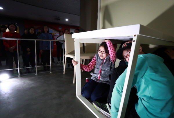 | ▲ 지진체험중인 아이들이 책상 밑으로 대피하고있다. | ||