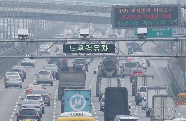 연일 극심한 미세먼지가 이어지자 서울시가 공해를 유발하는 노후 경유차 운행제한에 속도를 내기로 했다. 이르면 다음달부터 ‘서울형 미세먼지 비상저감조치’가 발령되는 날 오전 6시부터 오후 9시까지 노후 경유 차량의 서울 진입을 제한하고 위반시 과태료 10만원을 부과한다. 사진은 27일 서울 강변북로 가양대교 부근에 설치된 노후 경유차 단속 CCTV와 운행제한 알림판.