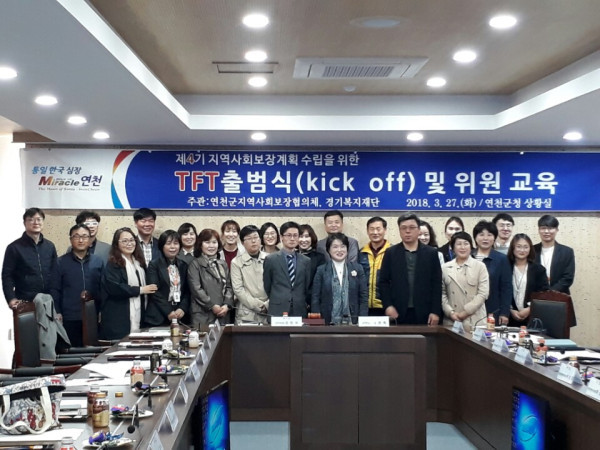 경기 연천군 지역사회보장협의체는 27일 연천군청 상황실에서 ‘제4기 지역사회보장계획 수립을 위한 테스크포스(TF)팀 출범식’과 함께 ‘위원 교육’을 실시했다. 사진은 출범식과 위원 교육 이후 관계자들이 기념촬영을 하는 모습. (사진제공=연천군청)