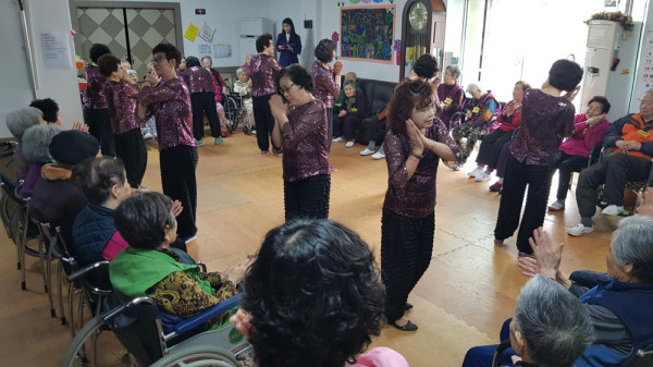 경기 동두천시 송내동 주민자치위원회에서 진행하는 주민자치 프로그램 맷돌체조 수강생 10여명이 28일 동두천노인복지요양센터에서 ‘찾아가는 주민자치 공연’을 실시했다. 사진은 참여자들이 공연을 선보이는 모습. (사진제공=동두천시청)