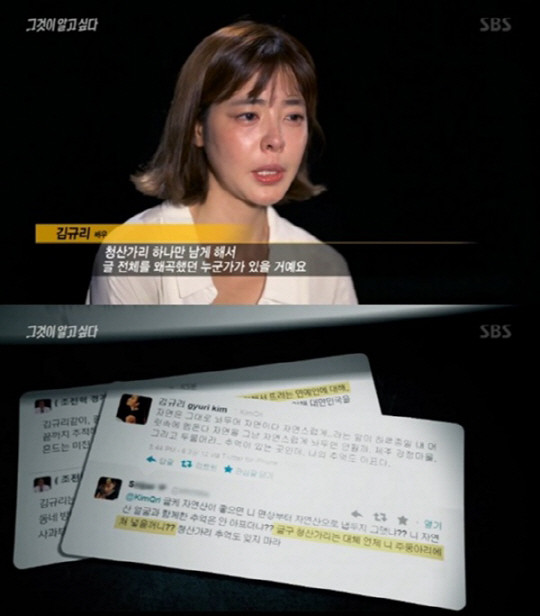 당시 방송에서 배우 김규리는 "청산가리 하나만 남게 해서 글 전체를 왜곡했던 누군가가 있을 거다. 그 누군가가 10년 동안 가만히 있지 않고 내 삶 사이사이에서 계속 나를 왜곡했다"며 악플로 인해 자살기도를 하기도 했다고 고백했다.