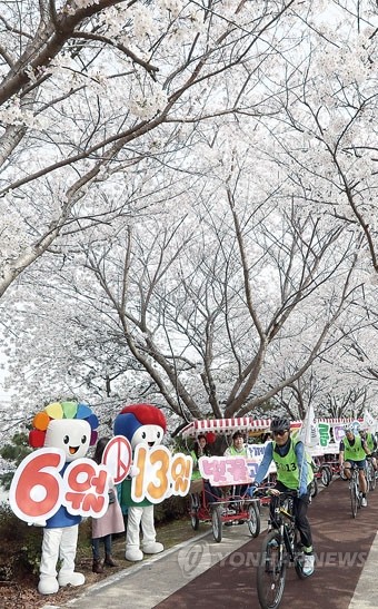 1일 낙동강변 30리 벚꽃축제가 열린 부산 강서구 맥도생태공원에서 부산시선거관리위원회가 제7회 전국동시 지방선거를 앞두고 유권자에게 지방선거 참여 분위기를 높이고자 아름다운 선거 홍보 캠페인을 벌이고 있다.