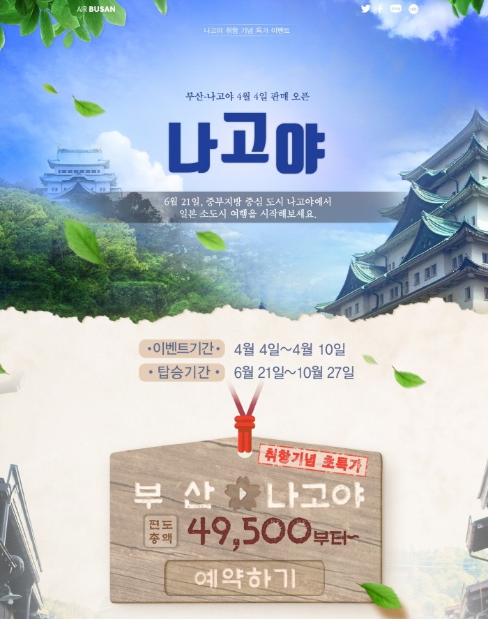 부산~나고야 노선은 부산 김해국제공항에서 월‧금‧토‧일요일 오전 8시 35분/화‧수‧목요일 오전 8시 25분에 출발하는 스케줄로 알찬 여행의 시작이 가능하다. 나고야 현지에서는 매일 오전 10시 45분 출발한다. 해당 노선에는 195석 규모의 A321-200 항공기가 투입된다.