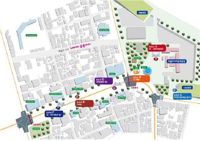 행사장소는 ▲A : 5·18민주광장(프린지형 넌버벌 퍼포먼스) ▲B : 시계탑(프린 지형 넌버벌 퍼포먼스) ▲C : 하늘마당(음악회 성격의 공연) ▲D : 어린이 문화원 입구(30대 타깃 공연 및 체험프로그램) ▲E :‘네파’ 매장 앞(자유형식 공연 콘셉트) ▲F : 5·18기록관 앞(자유형식 공연 콘셉트)이다.