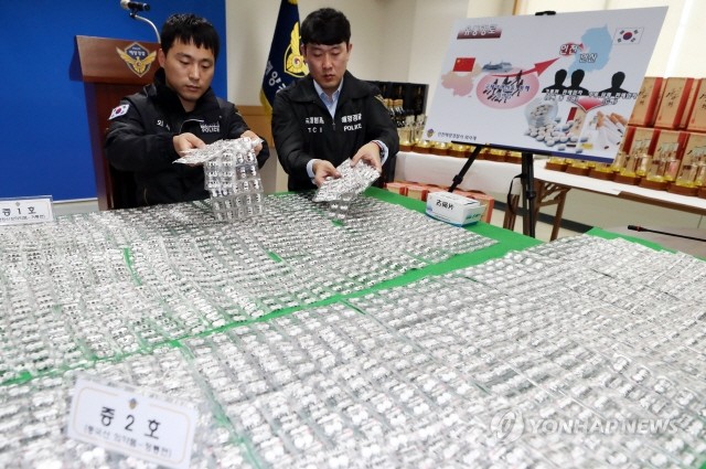 3일 오전 인천시 연수구 인천해양경찰서에서 해경들이 압수한 밀수 중국산 해열진통제 '거통편'(去痛片)을 공개하고 있다. 향정신성의약품인 '페노바르비탈'이 함유된 알약 형태의 거통편은 중국에서 해열진통제로 정상 판매되는 의약품이지만 국내에서는 마약류로 분류돼 있다. 인천해양경찰서는 마약류 관리에 관한 법률 위반 및 약사법 위반 혐의로 A(46)씨와 B(36)씨 등 슈퍼마켓 운영자 2명을 불구속 입건했다고 이날 밝혔다.