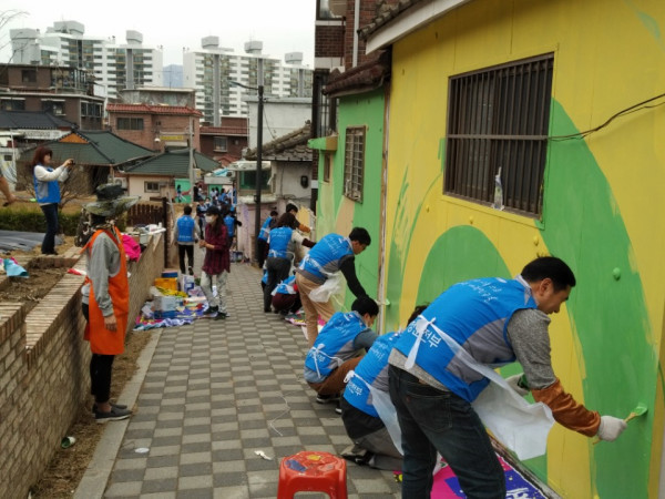 은평구 신사제2동 주민센터는 최근 사회복지NGO 단체인 ‘해피피플(HAPPY PEOPLE)’의 연계를 통해 행정안전부 ‘행복드림봉사단’과 함께 신사동 산새마을 텃밭일대 약 100m의 노후벽면 벽화그리기 봉사활동을 가졌다. 사진은 참여자들이 벽화를 그리는 모습. (사진제공=은평구청)