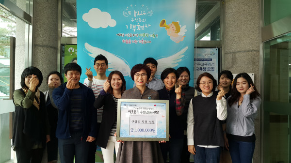 경기 용인시 기흥구 구성동 직원들은 3일 지난해 시정 주요업무 추진평가에서 우수한 성적을 거둬 받게된 포상금 200만원 중 100만원을 ‘사랑의 열차 이어달리기’ 성금으로 기탁했다. 사진은 기탁식에 참석한 구성동 관계자들이 기념촬영을 하는 모습. (사진제공=용인시청)