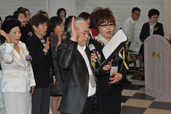 대한미용사회 경기북부지회 동두천시지부에서는 3일 농협 하나로 웨딩홀에서 정기총회 및 위생교육을 실시했다. 사진은 총회에 참여한 미용인들이 선서를 하고 있는 모습. (사진제공=동두천시청)