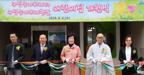 4일 송파구 위례 신도시 우리례포레샤인 23단지에 위치한 송파위례23·위례햇살 구립어린이집이 동시 개원했다. 사진은 개원식에 참석한 구청장과 관계자들이 테이프 커팅식을 하고 있는 모습. (사진제공=송파구청)