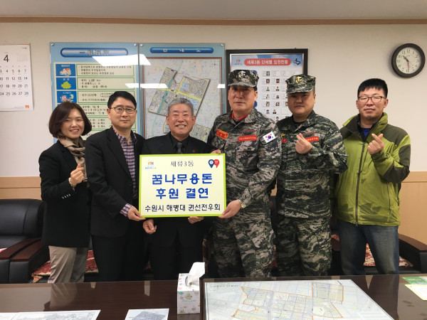 경기 수원시 권선구 세류3동은 4일 해병전우회 권선구지회와 ‘희망꿈나무 용돈 받기 사업’ 협약을 맺었다. 해병전우회 권선구지회는 세류3동 청소년들을 위해 2년간 30계좌를 후원한다. 사진은 관계자들이 기념촬영을 하는 모습. (사진제공=권선구청)