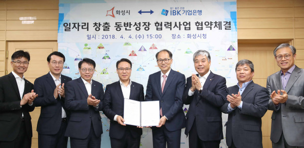 경기 화성시는 4일 시청 접견실에서 IBK기업은행과 ‘일자리 창출 동반성장 협력사업’ 업무협약을 체결했다. 이로써 향후 시 일자리 창출에 기여한 우수 중소기업은 최대 3억원까지 저리로 운영자금 대출이 가능하다. 사진은 관계자들이 기념촬영을 하는 모습. (사진제공=화성시청)