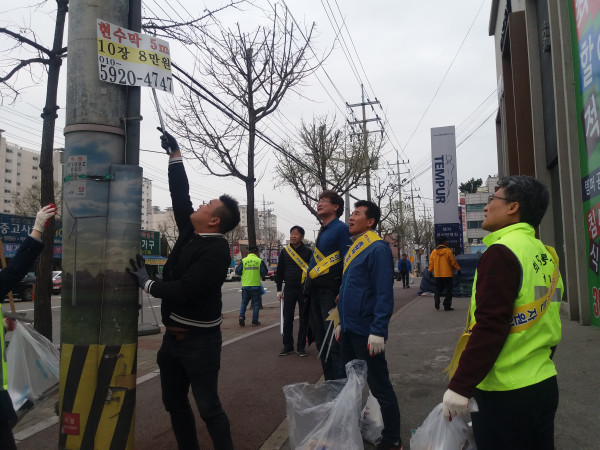 경기 수원시 권선구 권선1동은 지난 2일 마을만들기협의회 마을 리더를 중심으로 수원시가구연합회 회원과 환경관리원 등 30여명이 참여한 가운데 권선로 가구거리 일대의 환경정비를 실시했다. 사진은 참여자들이 전신주의 불법 광고물을 제거하고 있는 모습. (사진제공=권선구청)