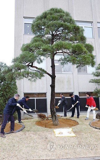 문재인 대통령과 부인 김정숙 여사가 식목일인 5일 오전 청와대 여민관 앞 화단에 소나무를 심고 있다. 왼쪽부터 문 대통령, 임종석 비서실장, 정의용 국가안보실장, 장하성 정책실장, 김 여사.