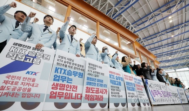 KTX해고승무원 문제해결을 위한 대책위원회, 철도노조 코레일관광개발지부 서울·용산·익산·부산지부 조합원 및 KTX열차승무지부 관계자 등이 5일 오전 서울역에서 KTX안전을 위한 승무원 직접고용 촉구 기자회견을 하고 있다.
