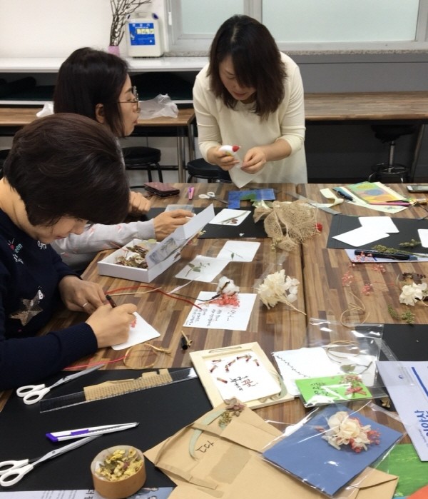 경기 안산시 호수동 행정복지센터는 5일 지역사회보장협의체 위원을 대상으로 업사이클링(upcycling) 교육을 실시했다. 사진은 참여자들이 재활용 종이를 이용한 마른 꽃 카드 만들기를 하고 있는 모습.(사진제공=안산시청)