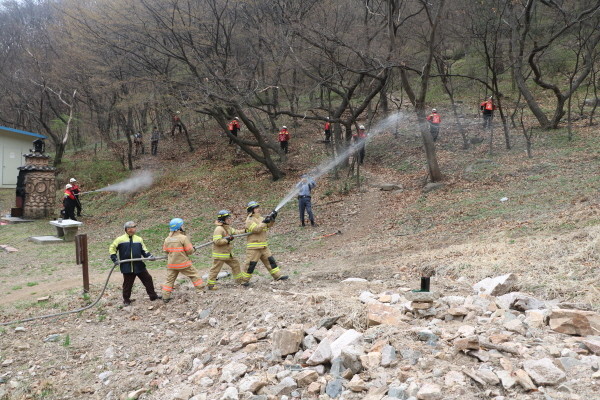경기 군포소방서는 지난 3일 봄철 산불예방 및 문화재보호를 위해 전통사찰 수리사를 대상으로 유관기관 합동훈련을 펼쳤다. 사진은 관계자들이 소화호스로 불 끄는 훈련을 하는 모습.(사진제공=군포소방서)