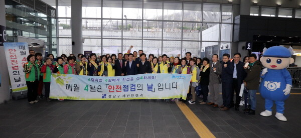 5일 서울 강남구가 안전점검의 날을 맞아 SRT수서역에서 ‘선진안전문화 운동 캠페인’을 실시했다. 사진은 캠페인을 마친 후, 캠페인 참여자들이 기념촬영하고 있는 모습.(사진제공=강남구청)