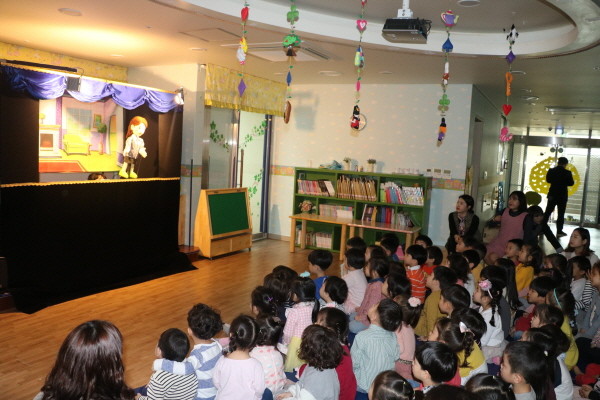 경기 군포소방서는 최근 군포시 한 시립어린이집을 찾아가 아이들을 대상으로 눈높이 ‘119안전인형극’ 공연을 성공리에 마쳤다. 사진은 인형극 공연이 진행 중인 모습.(사진제공=군포소방서)