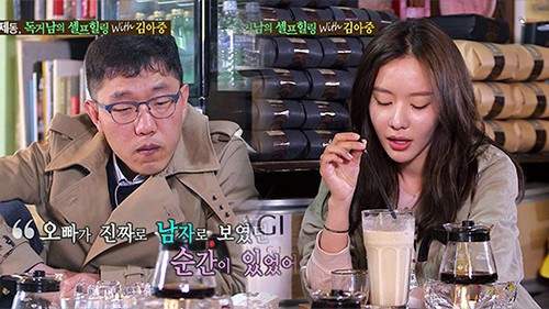 이어 김아중은 "오빠가 남자로 보였던 순간이 있었다. 3년 전인가? 오빠가 저에게 전화해서 법정 스님의 책을 읽어준 적이 있다. 거의 책 한 바닥을 읽어주셨다. 그때 이 남자 되게 감동적이다라고 생각했다"고 말해 김제동을 설레게 했다.