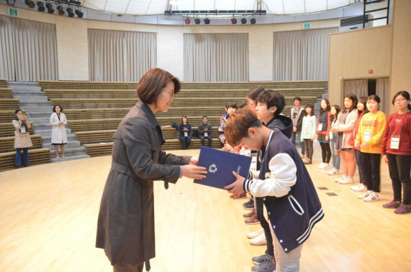 최근 (재)은평문화재단이 은평문화예술회관내 숲속극장에서 2018 세종우리동네프로젝트 ‘은평구청소년뮤지컬단’의 입단식을 열고, 간단한 교육프로그램을 진행했다. 사진은 입단증을 수여받고 있는 단원들의 모습. (사진제공=은평구청)