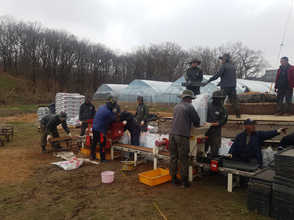 경기 양주시 광적면 102공병대는 지난 6일 농번기 대민지원의 일환으로 효촌2리 벼모판 못자리 영농작업을 실시했다. 사진은 부대원들이 열심히 작업을 하고 있는 모습. (사진제공=양주시청)