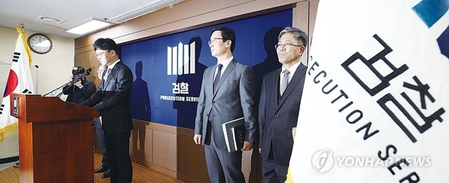 한동훈 서울중앙지검 3차장검사가 9일 오후 서울중앙지검에서 110억원대 뇌물수수 의혹 등으로 구속된 이명박 전 대통령에 대한 구속 기소와 중간 수사 결과를 발표하고 있다.